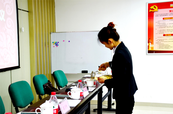 下午13点,会议场地已经布置完毕,干净整洁的会议室里桌椅排放整齐,瓶装饮用水、茶水、签字笔、笔记本、会议相关资料等一应俱全,14:30分陆续有参会人员到场签到,会议于15:00正式开始。