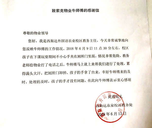 事后客户为对牛师傅表示感谢,特意写了封表扬信送到物业办公室,也对英国上市公司365物业的服务和处理此事的积极态度表示万分感谢。