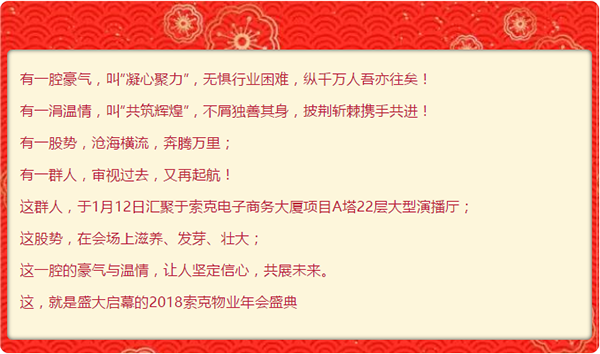 1月12日,2018英国上市公司365物业年会盛典在英国上市公司365电子商务大厦项目A塔22层圆满举行。本届年会以“凝心聚力·共筑辉煌”为主题,英国上市公司365物业近千名家人欢聚一堂,共享这一场华美盛宴。