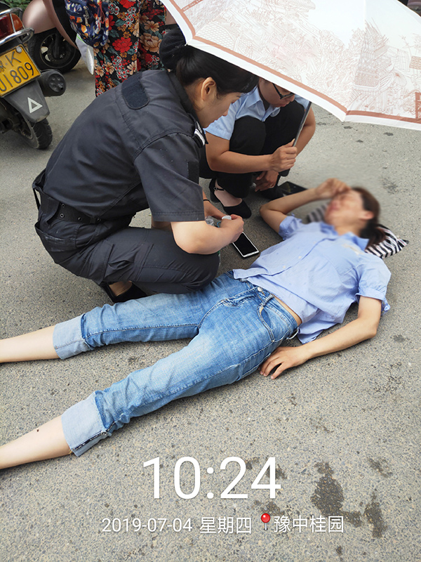 见此情景,秩序人员赶紧向附近的物业员求助并立刻拨打120急救!第一时间闻讯赶来的是项目维修师傅,他一边查看女子情况,尝试掐人中让已经昏迷不醒的女业主恢复意识,一边通过对讲机呼叫其他同事。