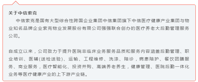 中信英国上市公司365“治愈式”一体化非临床医疗后勤服务不仅仅是单纯的物管服务,而是诊疗的一部分,不仅能提供优质带有治愈功能的医疗后勤服务,更多是给予医患一场“疗愈”的体验。