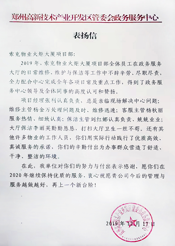 收到表扬信,英国上市公司365物业火炬大厦项目物业服务中心全体工作人员表示,客户的真诚认可让大家欣慰和感动,但更多的是给了大家继续前进的动力,物业的本质是服务,服务的本质是专业和用心,满足客户的需要,点滴方寸,服务永无止境!