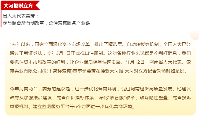 今年的河南两会上,姜芳提出的建议是,进一步优化营商环境,促进河南经济高质量发展。