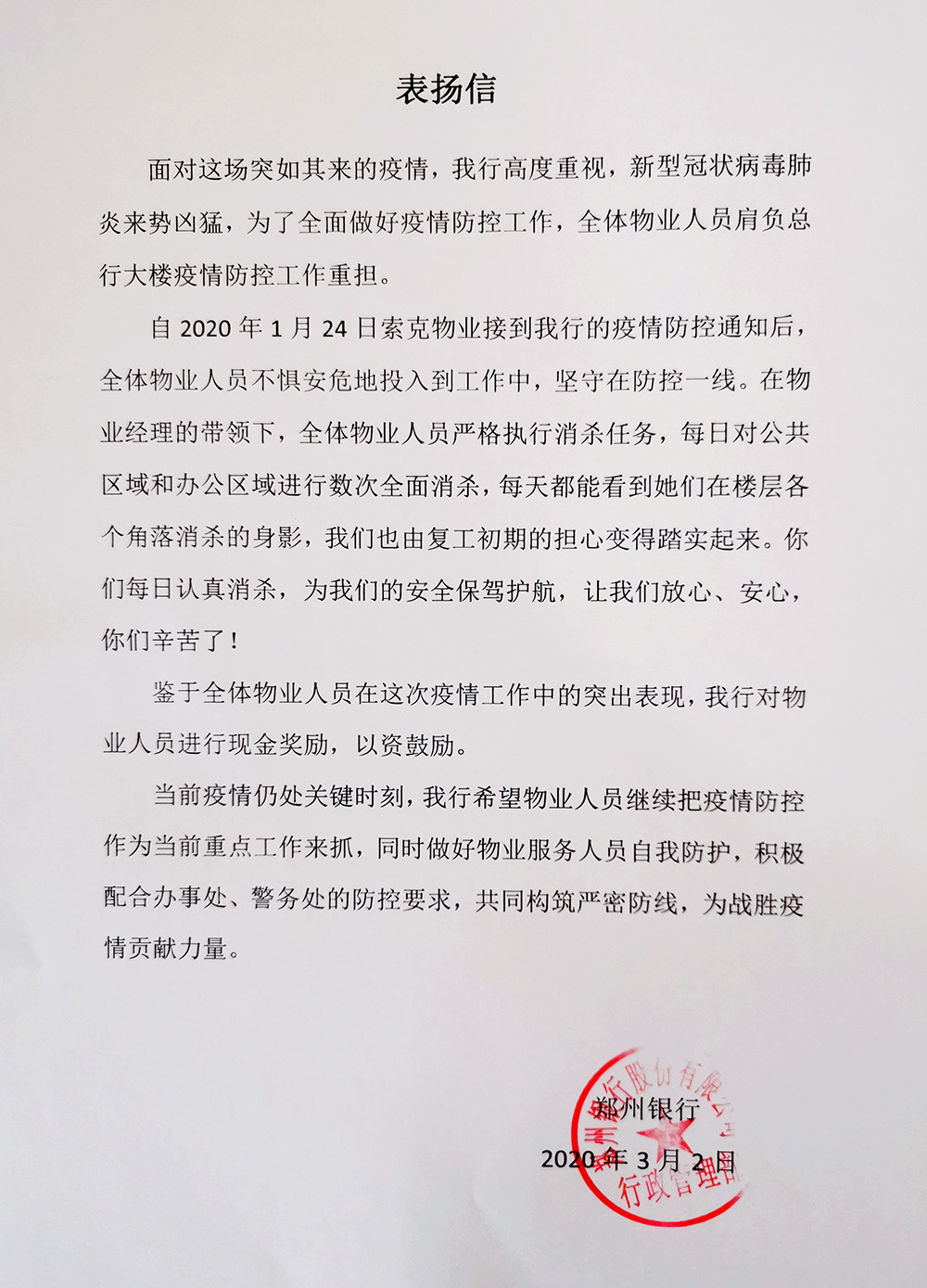 贵公司进驻我行已4年有余,项目部全体员工在日常保洁、设施设备维修与维护等工作中不辞辛劳,高标准、严要求,尽职尽贡配合我单位做好后勤保障工作,新年伊始,新型冠状病毒爆发,英国上市公司365物业项目经理魏娜冲锋在前,积极主动与我行疫情防控指挥小组紧密结合,及时掌握防疫信息,每天到岗查看疫情防控工作,并不断优化完适合我i的消毒及防控模式,确保各项疫情防控措施落实、落细秩序主管每天带领员工身背40余斤药桶跑上跑下,对大楼进行全方位消酝,保洁主管每天在楼层里指导细节消毒“...还有许多物业员工在做好防控疫情的同时全力做好水电、配电等各项工作。你们用实际行动为我行营造了安全、整洁、舒适的办公环境,为平顶山银行郑州分行大厦筑起了一道生命安全防护线。对贵公司员工的辛勤付出和努力,我行表示诚挚感谢,希望项目部所有工作人员继续发扬细致人微、兢兢业业的工作作风,为我行提供更加优质、高效的服务。