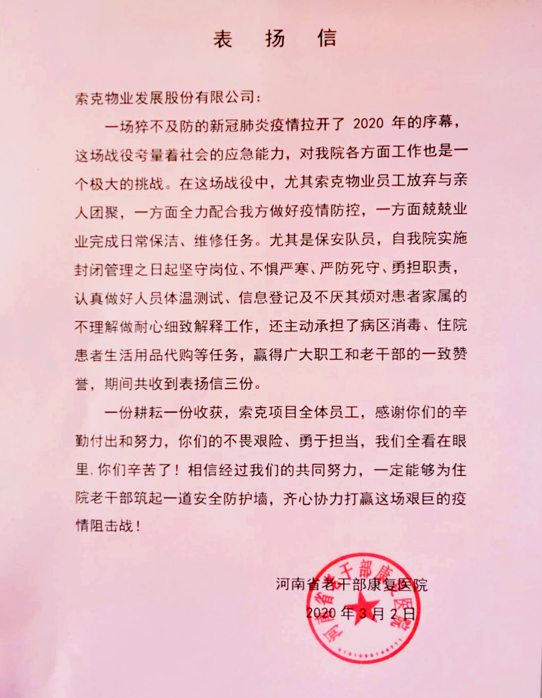 一场猝不及防的新冠肺炎疫情拉开了2020年的序幕,这场战役考量着社会的应急能力,对我院各方面工作也是一个极大的挑战。在这场战役中,尤其英国上市公司365物业员工放弃与亲人团聚,一方面全力配合我方做好疫情防控,一方面兢兢业业完成日常保洁、维修任务。尤其是保安队员,自我院实施封闭管理之日起坚守岗位、不惧严寒、严防死守、勇担职责,认真做好人员体温测试、信息登记及不厌其烦对患者家属的不理解做耐心细致解释工作,还主动承担了病区消毒、住院患者生活用品代购等任务,赢得广大职工和老干部的一致赞誉,期间共收到表扬信三份。一份耕耘一份收获,英国上市公司365项目全体员工,感谢你们的辛勤付出和努力,你们的不畏艰险、勇于担当,我们全看在眼里,你们辛苦了!相信经过我们的共同努力,一定能够为住院老干部筑起一道安全防护墙,齐心协力打贏这场艰巨的疫情阻击战!