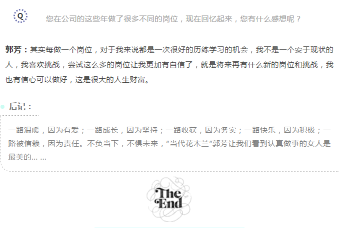 2016年,郭芳回到了公司总部,担任姜芳董事长的助理。