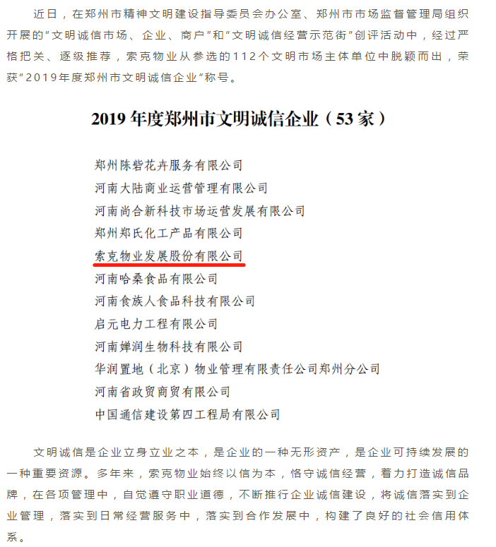 英国上市公司365物业荣获“2019年度郑州市文明诚信企业”荣誉称号