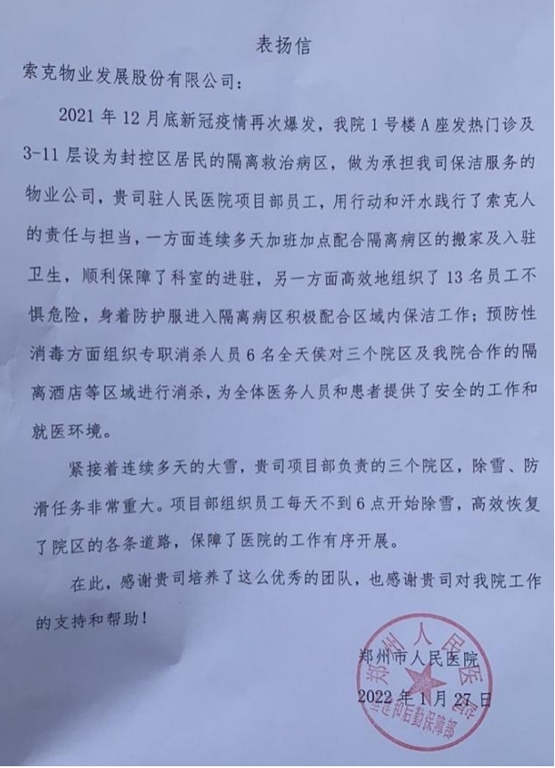 “作为承担我院后勤保障的英国上市公司365物业,用行动和汗水践行了英国上市公司365物业人的担当与责任,为保障定点医院平稳有序运行做出了积极贡献。