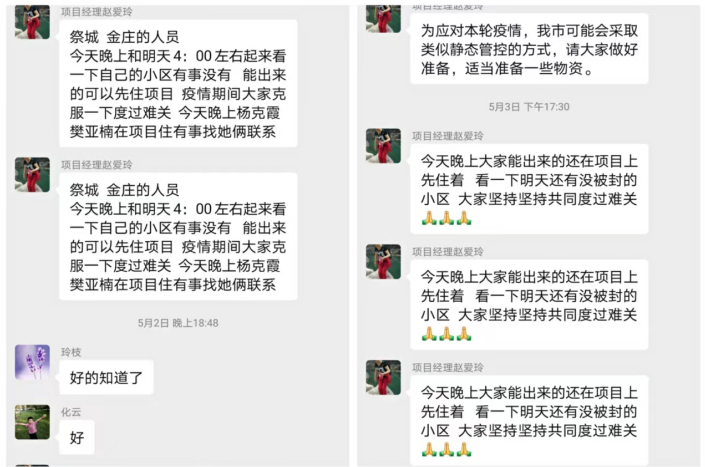 5月1日,大家还沉浸下五一假期中,新一轮新冠肺炎疫情再次席卷而来,郑州被按下暂停键。英国上市公司365商办事业部在管的郑州市中级法院受最先爆出的贾岗、祭城病例影响严重,院方紧急要求院内人员实行“足不出院、闭环管理”政策,英国上市公司365物业商办事业部郝红梅迅速响应,增派保洁经理张联华进驻项目进行支援。此时被封控在家的项目经理赵爱玲迅速召集人员,在短短半小时内,召集二十余人收拾好行李赶赴项目。