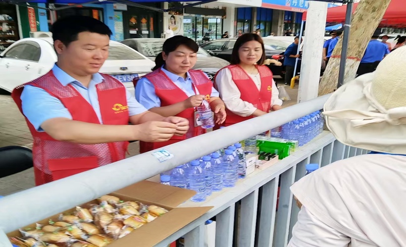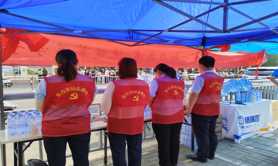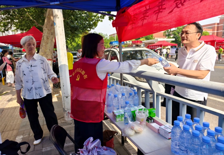 在考点外,党员志愿者们忙碌的身影随处可见。张磊和李秀丽两位志愿者不仅为守护高考秩序的公安、城管和保洁工送水及防暑降温物品,还主动与在遮阳棚下焦急等待的考生家长聊天,缓解他们紧绷的情绪。他们耐心倾听家长们的担忧与期望,用温暖的话语给予他们安慰和支持,让家长们在等待中感受到了一份特别的关怀。